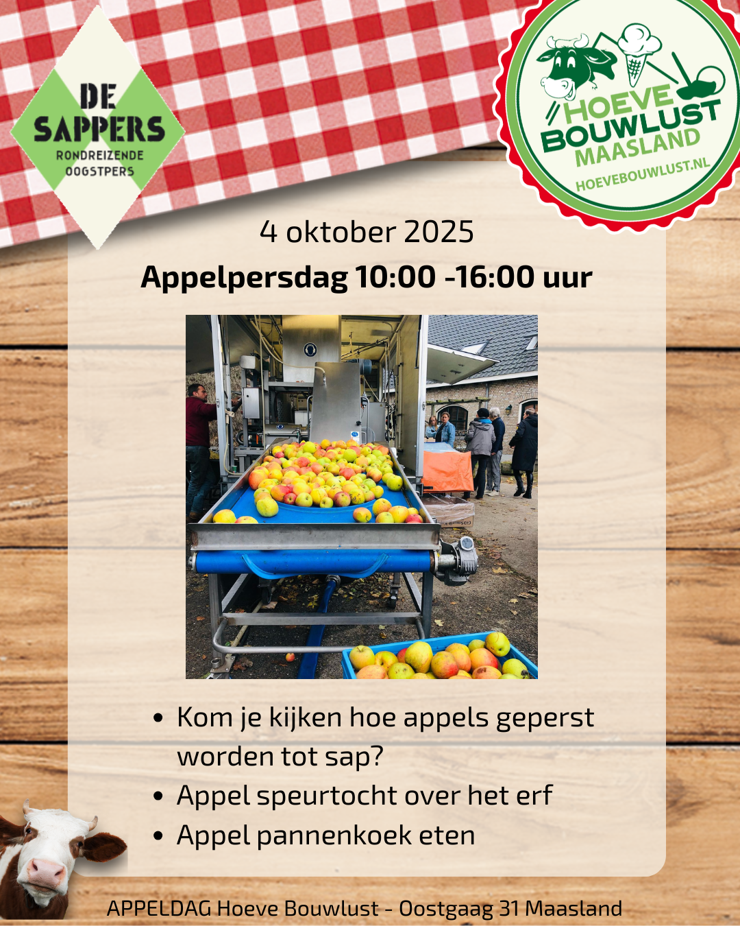 Zaterdag 4 oktober komen ‘De Sappers’ langs op de boerderij. Zij persen de oogst van  particulieren en ondernemers tot heerlijke sap. Dit proces kun je helemaal volgen en met eigen ogen zien!